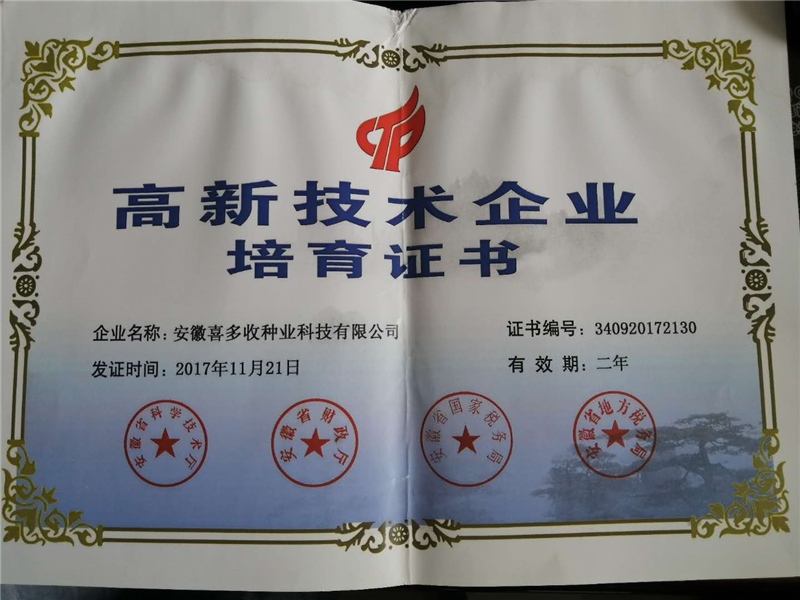 高新企業(yè)技術(shù)培育證書 | 2017年 | 安徽省科學(xué)技術(shù)廳 |