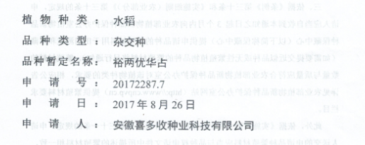 裕兩優(yōu)華占品種權(quán)申請(qǐng)受理通知書