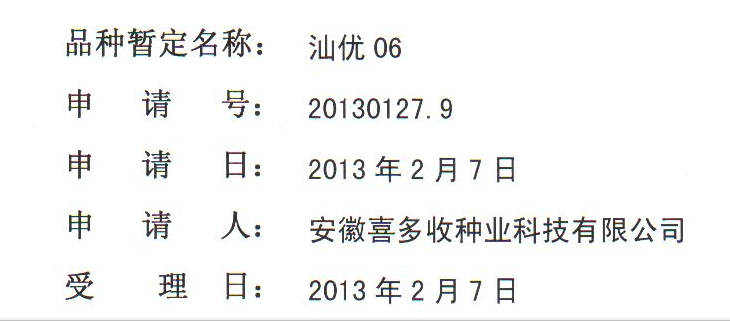 汕優(yōu)06品種權(quán)申請(qǐng)受理通知書
