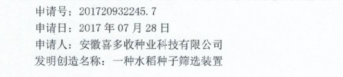 實(shí)用新型專利《一種水稻種子篩選裝置》專利申請(qǐng)受理通知書