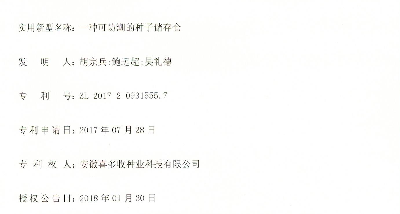 實用新型專利《一種可防潮的種子儲存?zhèn)}》授權證書