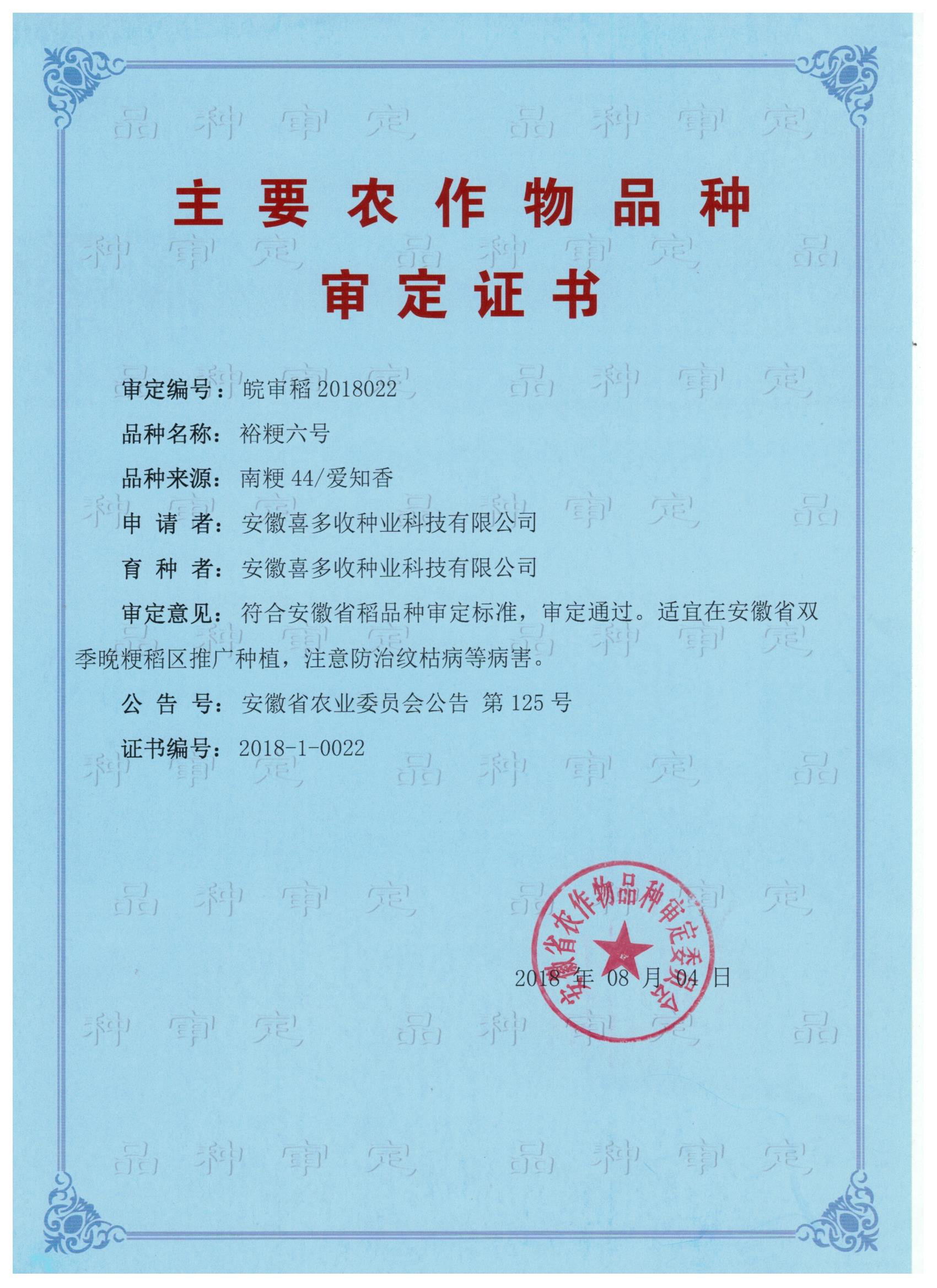 裕粳六號(hào)審定證書