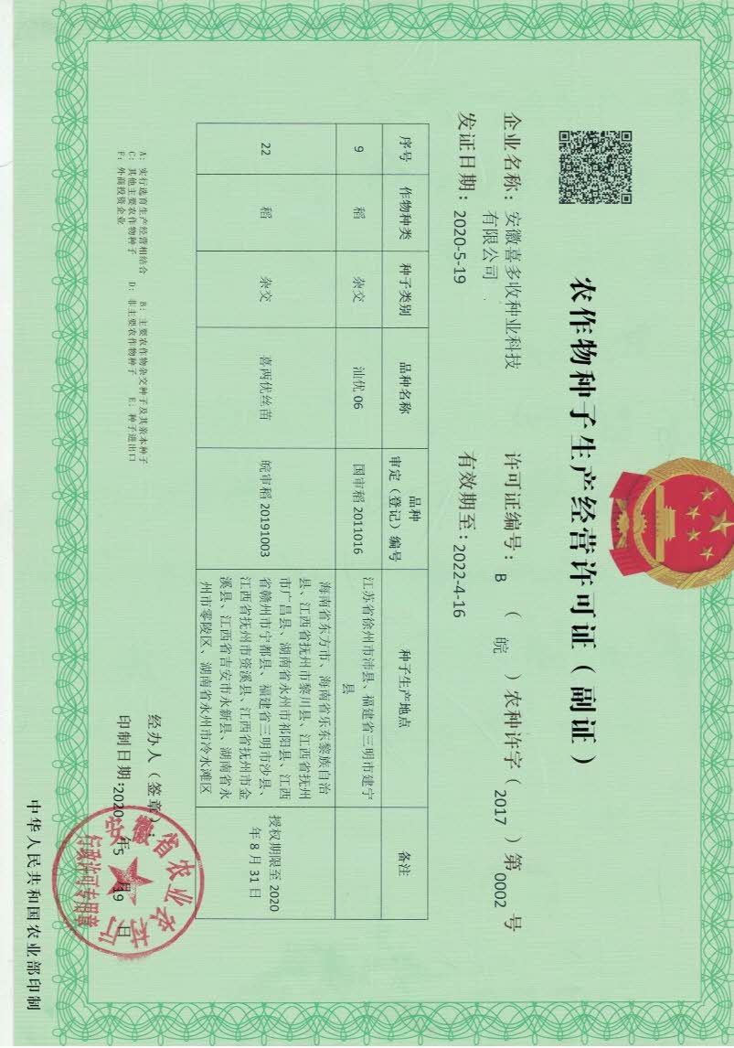 喜兩優(yōu)絲苗生產(chǎn)許可證變更
